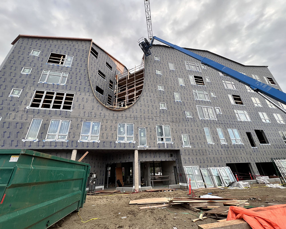 Progress continues on our new community services hub at the end of Inlet Avenue, and every day brings exciting changes! The roof is up, windows are being installed, and the building envelope is taking shape. Its distinctive cupped design, symbolizing hands of care, is now clearly visible.