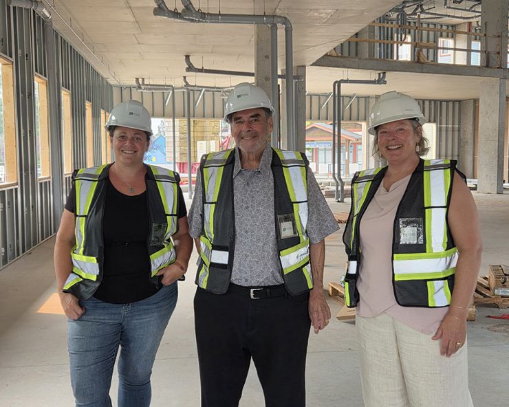 Len Libin (centre) with daughter Shayla (left) and SCCSS Executive Director Catherine Leach on site for Building Together, which will bring 35 affordable homes and two floors of SCCSS programs to Sechelt. Len’s $150,000 gift honours his late wife, Judi.